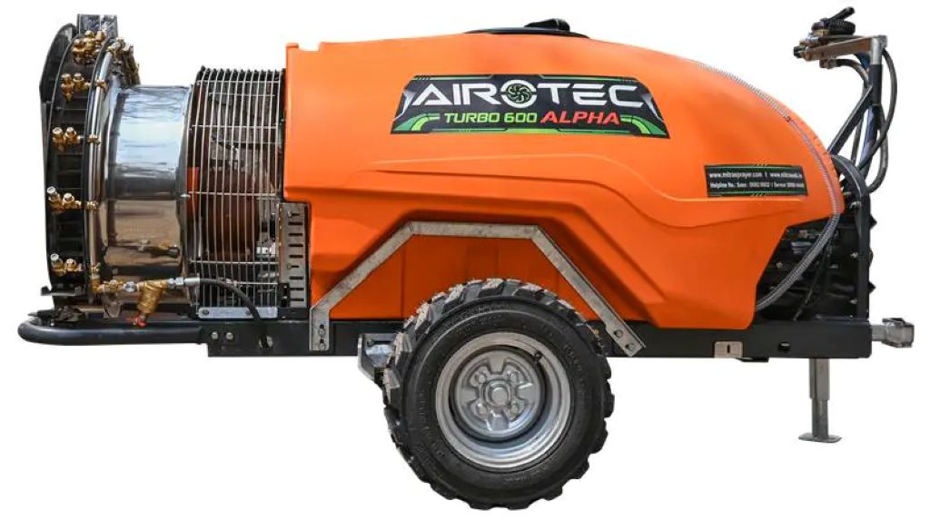 The AIROTEC Turbo 600 Alpha has been built specifically for fruit crops such as grapes and pomegranates. Designed for real world orchard conditions, the tractor driven sprayer features a 600 liter compact tank, a 75 LPM diaphragm pump, and a 616 mm fan capable of delivering air output up to 32 meter per second. Together, these features ensure uniform coverage across plants, addressing the issue of uneven application seen in traditional methods. The sprayer is compatible with both Mahindra and non Mahindra tractors and is lightweight, contributing to lower fuel consumption.